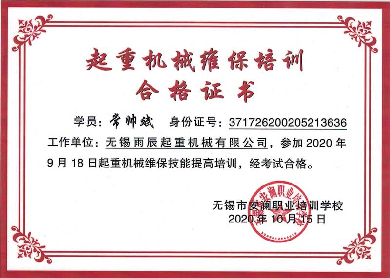 起重機(jī)械維保培訓(xùn)合格證書-常帥斌